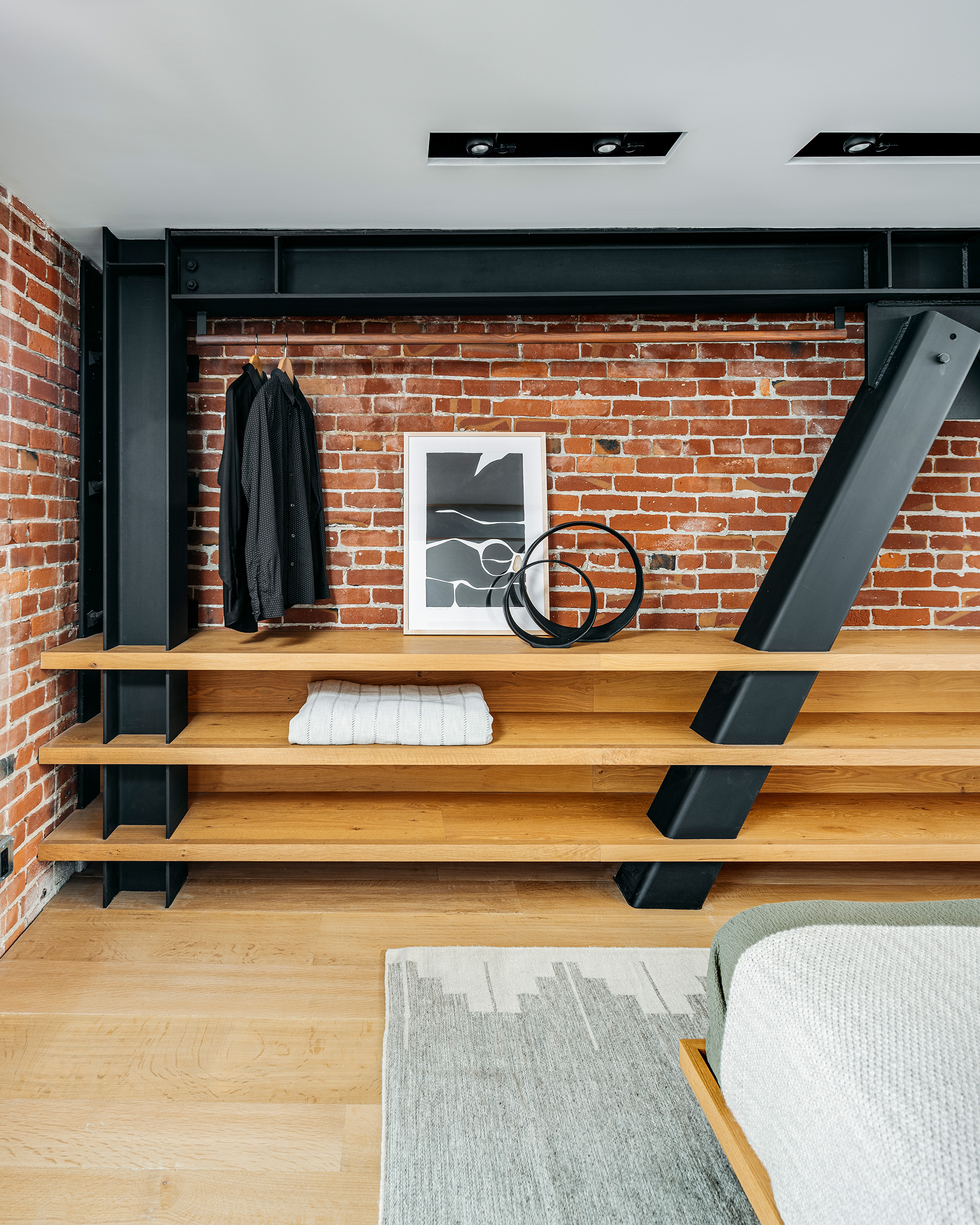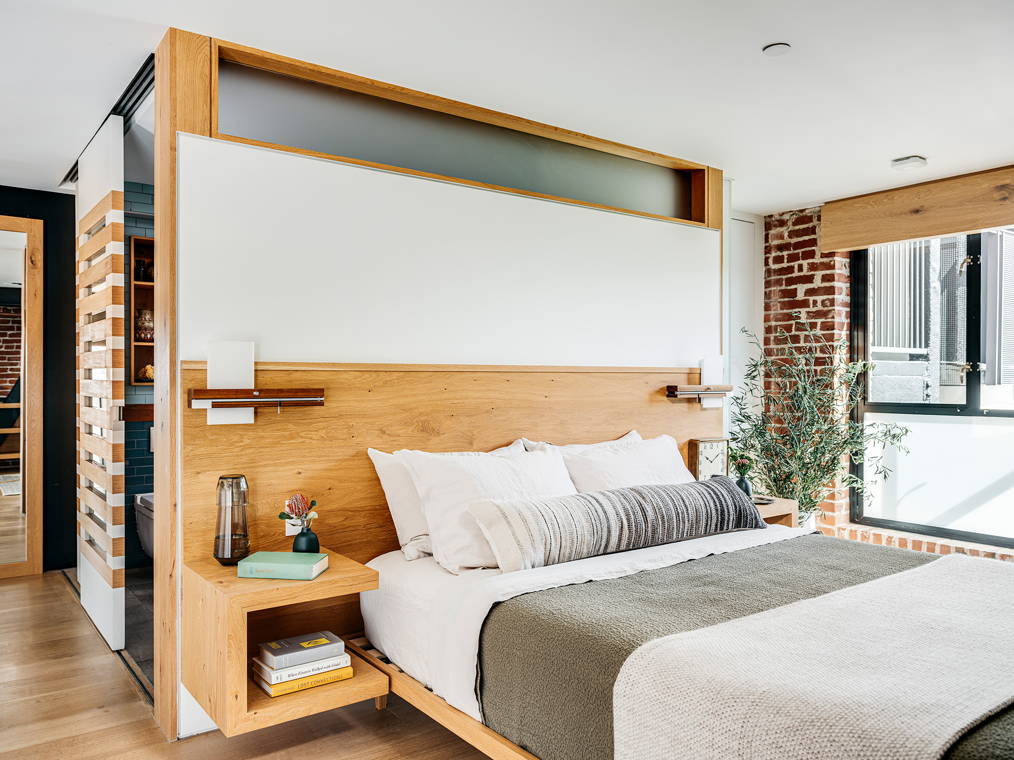 - Master Bedroom includes custom white oak bed, nightstands, and closet shelving
